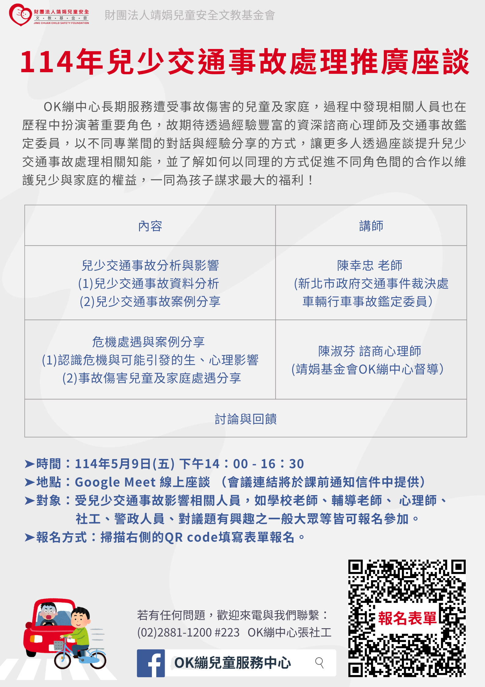 | 主旨: | 財團法人靖娟兒童安全文教基金會OK繃兒童服務中心辦理「114年兒少交通事故處理推廣座談」,詳如說明,請查照。 |
