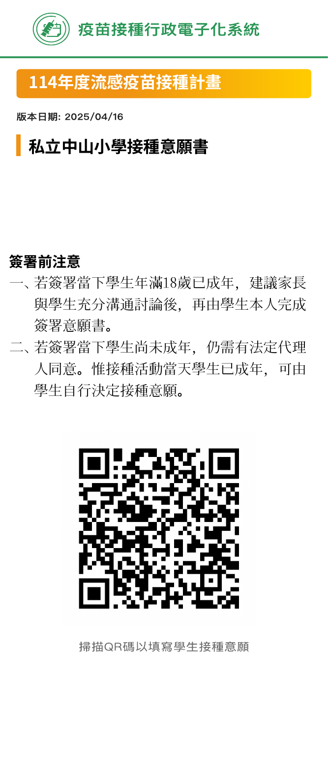 ✅本校於114年10月21日星期二 進行校園流感疫苗接種服務,疾病管制署 提供疫苗接種行政電子化系統(NIAS)簽署,以網頁連結網址及QR code的方式,只需要用手機或平板掃描QR code或點選QR code下方連結,即可於線上完成簽署作業,填寫說明如下。