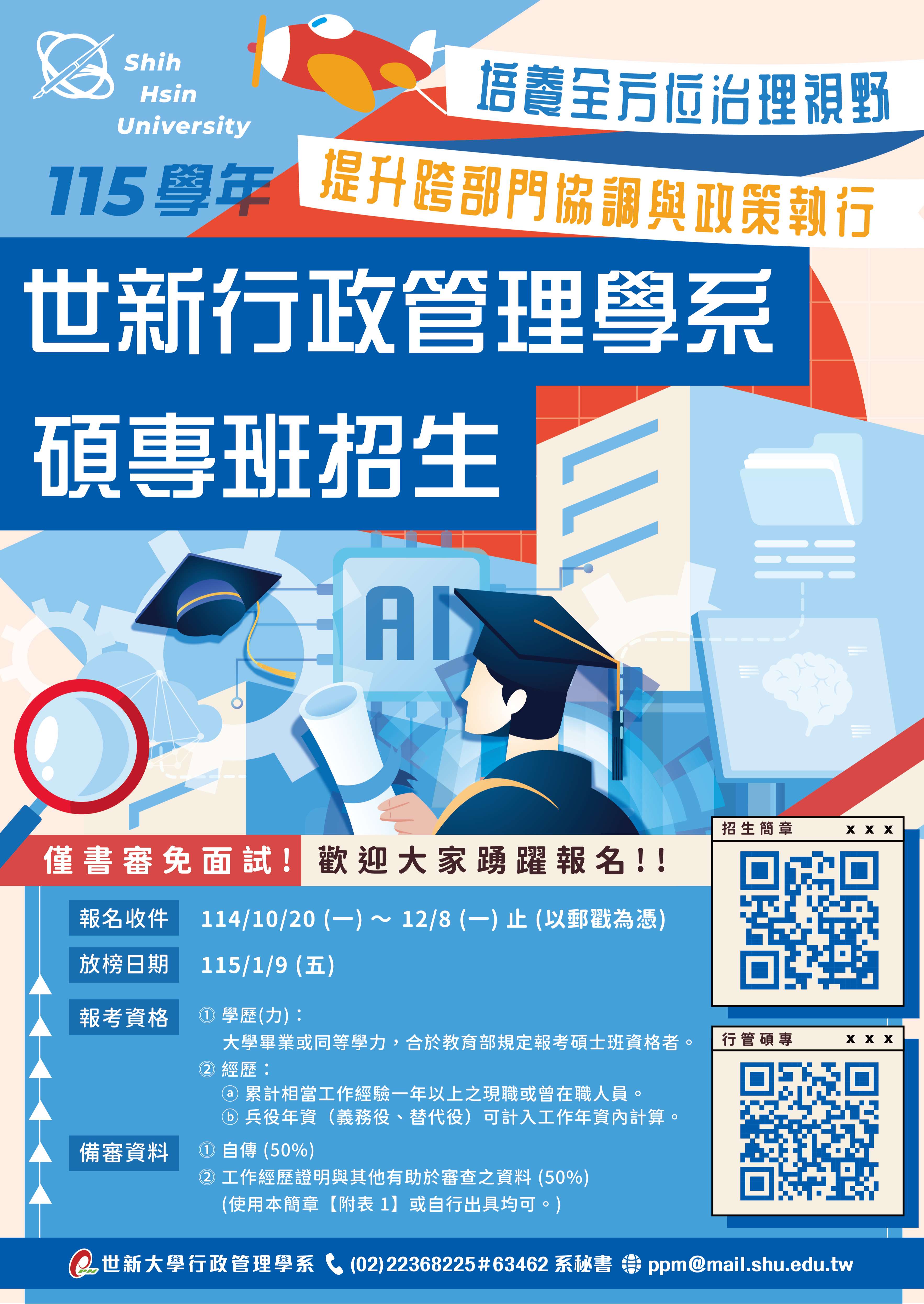 一、本校行政管理學系碩士在職專班,課程設計兼具理論與實務培養全方位治理視野,提升跨部門協調與政策執行,協助職涯發展。