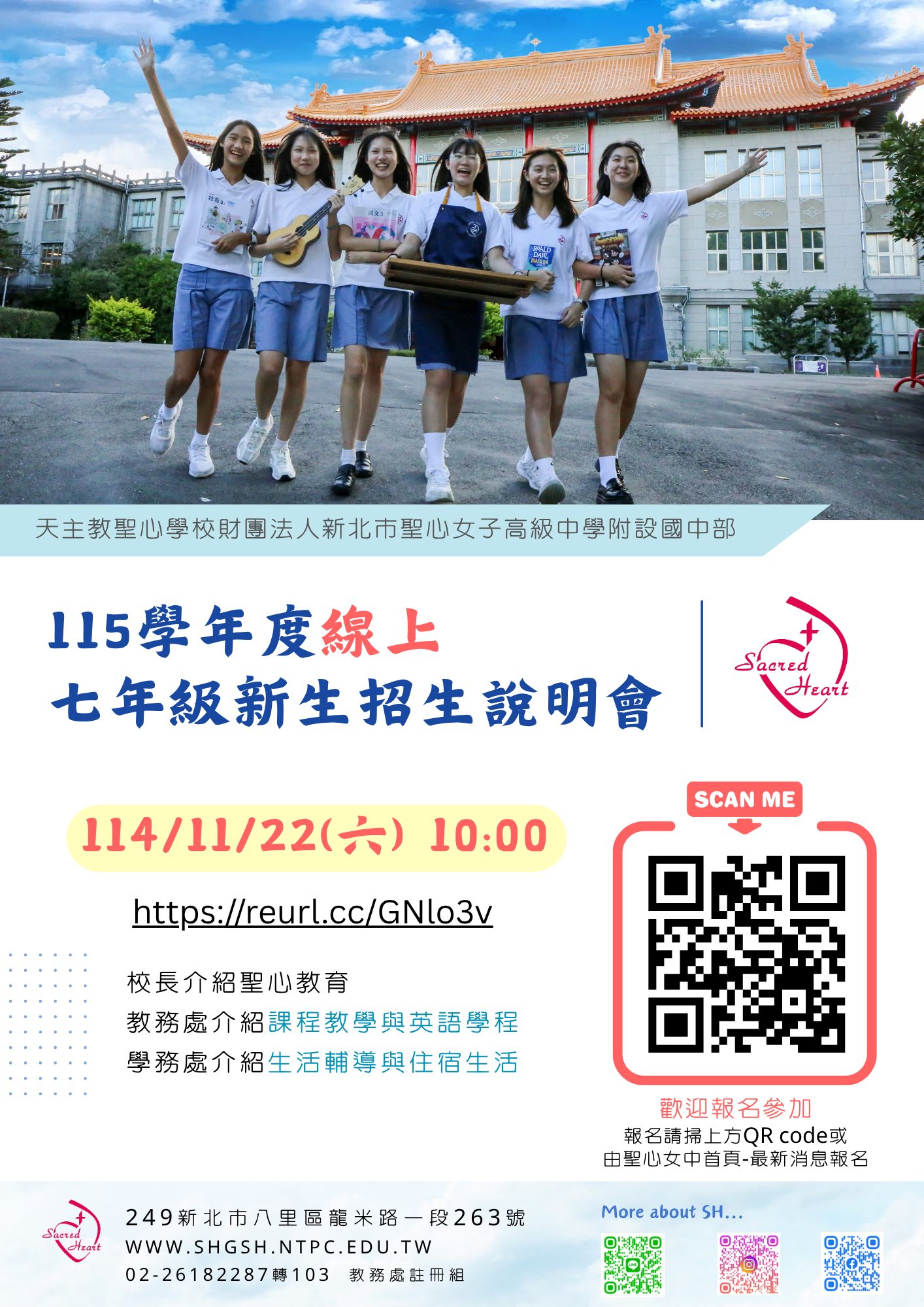 聖心女中官網 → 最新消息 →「115學年度七年級新生線上招生說明會」:http://www.shgsh.ntpc.edu.tw