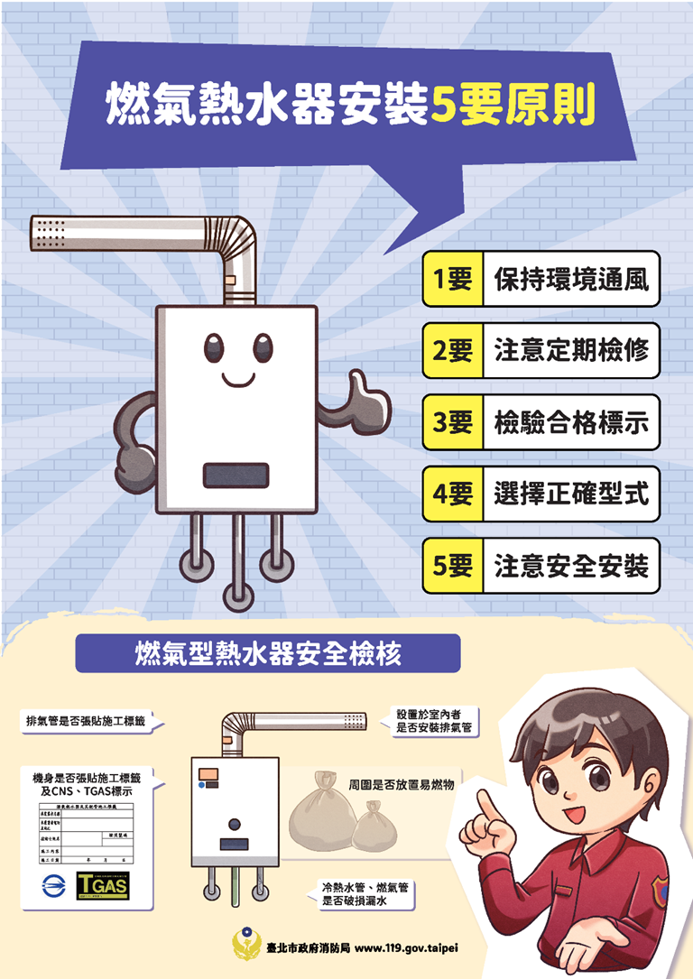 安裝熱水器,做對五件事(五要),遠離隱形殺手「一氧化碳」: